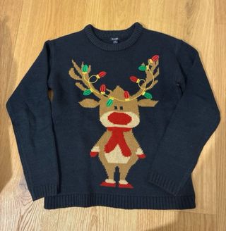 Maglione natalizio a tema renna. - Colore blu scuro. - Design con renna e luci natalizie. - Maniche lunghe.