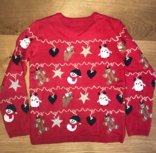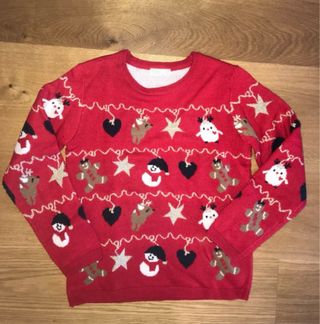 Maglione rosso a tema natalizio per bambina, firmato OVS. Presenta simpatici personaggi come pupazzi di neve, renne e omini di pan di zenzero. - Design a tema natalizio. - Colore rosso vivace. - Personaggi natalizi all-over.