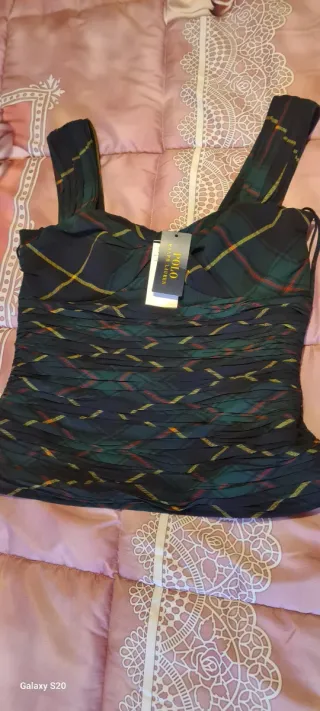 Elegante top Polo Ralph Lauren con un vivace motivo a fantasia tartan. Il design presenta un corpetto drappeggiato che aggiunge un tocco di raffinatezza. - Fantasia tartan multicolore. - Corpetto drappeggiato. - Spalline sottili.