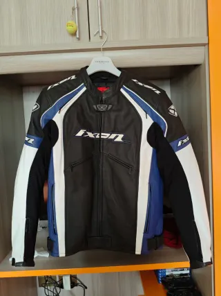 Giacca da moto Ixon in pelle, completa di protezioni, usata letteralmente 1 volta. Taglia L - Materiale: Pelle - Colore: Nero, bianco e blu