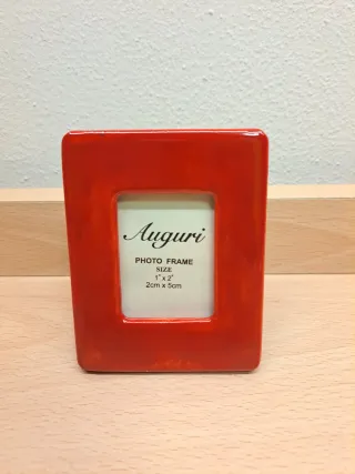 Bellissima cornice portafoto rossa! Nuova nella sua confezione originale. Dimensioni: circa 10x7,9x1,4 Peso: circa 102 grammi Per foto da 7x5,4 cm. Il riquadro visibile è da 5,1x3,8 cm. (Le dimensioni indicate sulla carta sono errate).