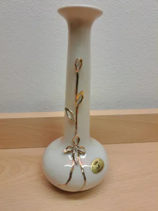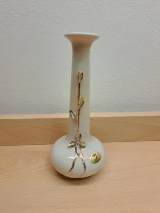 Vasetto molto carino per fiorellini. In porcellana Capodimonte. Color bianco e oro. Con decorazioni floreali a rilievo. Usato. Dimensioni: circa 7,8x7,7x16,7 cm In alto il diametro esterno è circa 3,7 cm, mentre il diametro dell'apertura per i fiori è di circa 1,5 cm. Peso: circa 157 grammi