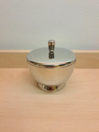 Elegante zuccheriera con coperchio. In acciaio inox. Vintage e di valore. Firmata Cronisil Fratelli Calderoni. In ottime condizioni. Dimensioni: circa 10x10x10 cm Peso: circa 323 grammi