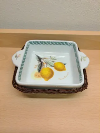 Terrina quadrata con manici nuova. Decorata con un motivo di limoni e il nome latino Citrus Limonum. Si trova all'interno del suo cestino intrecciato in vimini. Marca Porcellane Tognana, collezione Le Terrine Botaniche. Dimensioni: circa 16,7x15,3x4,5 cm Peso: circa 490 grammi