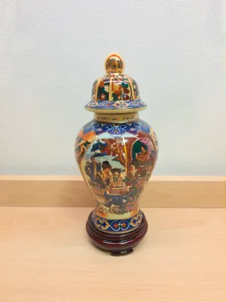 Bellissimo vaso vintage cinese! Marca Royal Satsuma. In ceramica o in porcellana. Decorato a mano. Presenta decorazioni policrome che raffigurano scene di vita e fiori. Il vaso ha un coperchio con un pomello dorato e poggia su una base di legno separata. Colori prevalenti: oro, rosso e blu. Ha qualche segnetto e una piccola crepa nella base in legno. Dimensioni: circa 10x10x23,5 cm Diametro apertura vaso: circa 4,4 cm Peso: circa 517 grammi