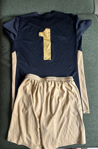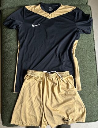 Completo da calcio Nike composto da maglia e pantaloncini. Taglia L - Maglia a maniche corte nera con dettagli oro. - Pantaloncini oro con laccetto in vita.