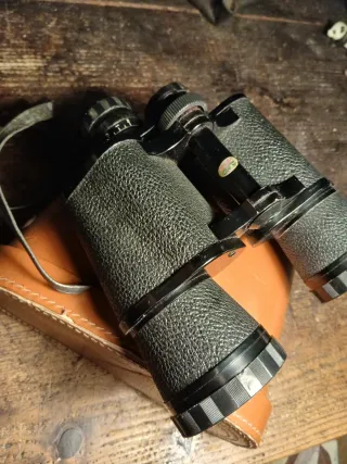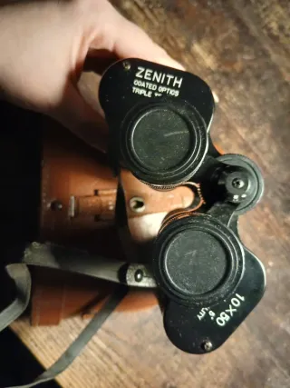Binocolo Zenith 10x50 in stile vintage, completo di custodia. - Involucro in similpelle nera. - Custodia in cuoio marrone. - Lenti con rivestimento multistrato.
