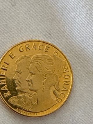 Moneta da collezione con i profili di Ranieri e Grace di Monaco. - Placato oro. - Dettaglio Monaco sul bordo. - Firma J.C. 71 incisa.
