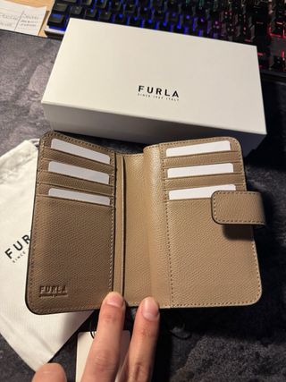 Portafogli Furla modello Camelia, compatto e di misura M. - Colore beige con dettagli oro. - Design elegante e funzionale.