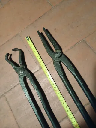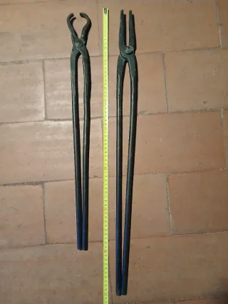 Coppia di pinze da fabbro antiche, ideali per collezionisti o per lavori di artigianato. - Lunghezza: 60 cm e 70 cm. - Materiale: Metallo scuro.