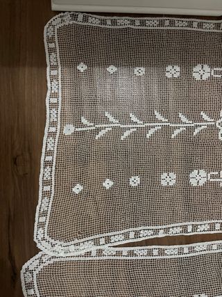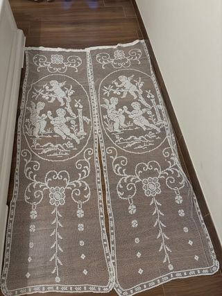 Deliziose tende vintage realizzate a mano con la tecnica del filet. Perfette per aggiungere un tocco di eleganza. - Motivo decorativo con putti e fiori. - Design classico e raffinato. - Ideali per finestre o come divisori.Le tende non vengono usate dal 1996