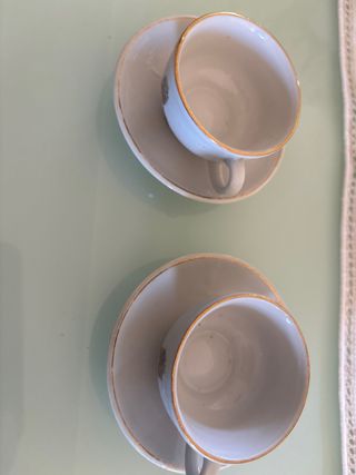 Set di due tazzine da caffè risalenti agli anni '40. Perfette per un tocco vintage. - Design classico. - Bordo dorato.ovviamente un po i segni del tempo si vedono ma sono sempre in ottime condizioni In pura porcellana , da collezione