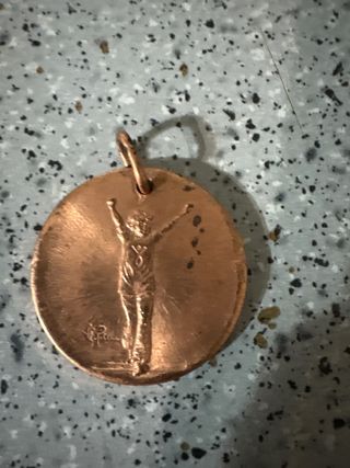 Medaglia vintage dei Giochi della Gioventù MPI. - Realizzata in metallo color rame. - Raffigura una figura stilizzata con le braccia alzate. - Presenta una piccola incisione nella parte inferiore.