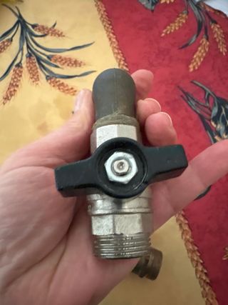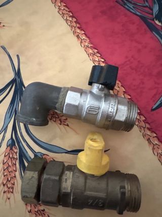 Due valvole rubinetto in metallo, ideali per casa e giardino. - Una valvola con manopola nera. - Una valvola con manopola gialla.