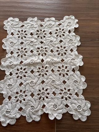 Delicato centrotavola realizzato a mano all'uncinetto, risalente agli anni '60. Un pezzo unico che aggiunge un tocco di eleganza retrò. - Motivo floreale a spirale. - Bordi decorati. - Lavorazione artigianale.