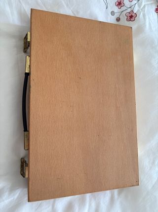 Scatola in legno per pittura, completa di tutto il necessario. - Materiale: legno. - Manico in metallo e corda elastica.