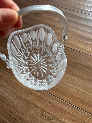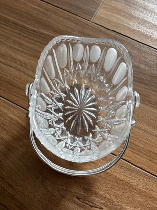 Elegante centrotavola vintage, perfetto per aggiungere un tocco di classe alla tua tavola. - Realizzato in vetro cristallizzato finemente lavorato. - Design classico con manico in metallo. - Ideale come centrotavola o portaoggetti decorativo.