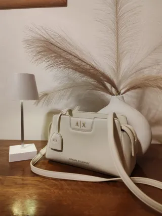 Borsetta Armani Exchange modello Amelie Messenger. - Colore beige con dettagli oro. - Logo AX sul fronte e sul charm. - Tracolla regolabile. Piccolo diffetto una piccola riga di penna, sel tutto irrilevante