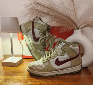 Scarpe da ginnastica Nike Dunk High numero 38.5 in ottime condizioni, pari al nuovo, singolo diffetto come mostrato in foto una piccola riga, nel resto perfette. Molto comode e leggere, interni perfetti senza nessuno rotture e puliti, esterno ottimo, suola in perfetto stato. - Tomaia in pelle beige e bianca. - Dettagli rossi. - Suola in gomma.