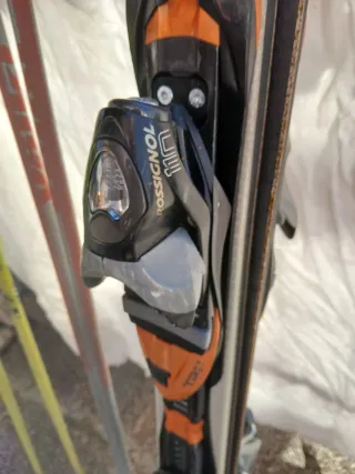 Set completo per lo sci composto da sci e bastoncini. - Sci Rossignol con attacchi. - Due paia di bastoncini da sci, uno giallo e uno rosso. - Design con inserti arancioni e bianchi.