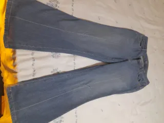 Jeans da donna in denim. - Modello a zampa. - Vita media. - Tasche anteriori e posteriori.
