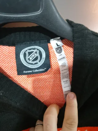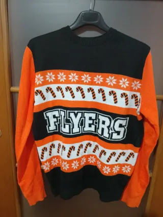 Maglioncino a tema natalizio con logo Flyers. - Design a righe con fiocchi di neve e bastoncini di zucchero. - Maniche arancioni. - Collo rotondo.