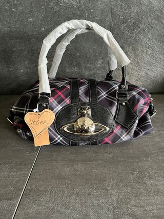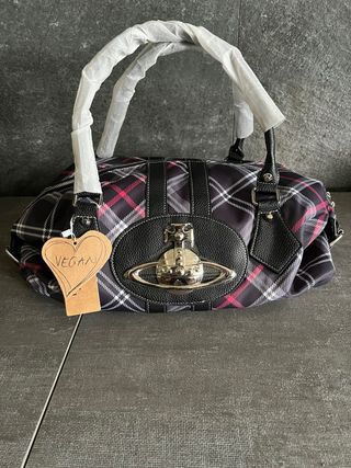 Borsa Vivienne Westwood con fantasia tartan. Un accessorio unico per completare il tuo look. - Fantasia tartan con dettagli rosa e bianchi. - Logo iconico Vivienne Westwood sul davanti. - Manici in ecopelle. - Targhetta VEGAN a forma di cuore.