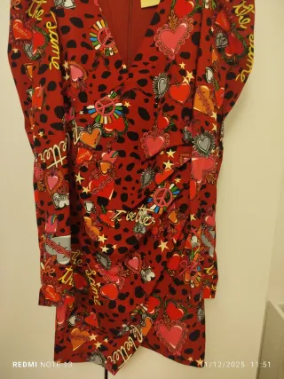 Vestito corto Aniye By con una vivace stampa di cuori e dettagli. Adatto per le feste ed altre occasioni .usato una sola volta. - Scollo a V. - Maniche a sbuffo - Tessuto stampato con cuori, stelle e scritte. - Dettaglio drappeggiato sul fianco.