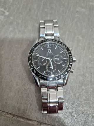 Orologio da polso Omega Speedmaster Professional. - Movimento automatico. - Quadrante nero. - Cinturino in acciaio argentato. - Ghiera tachimetrica.