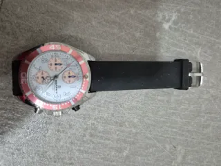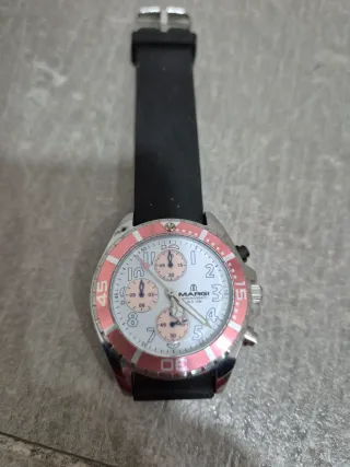 Orologio MARGI con quadrante bianco e dettagli rosa. - Cinturino in gomma nero. - Lunetta girevole rosa. - Cronografo. - Resistente all'acqua 30M.