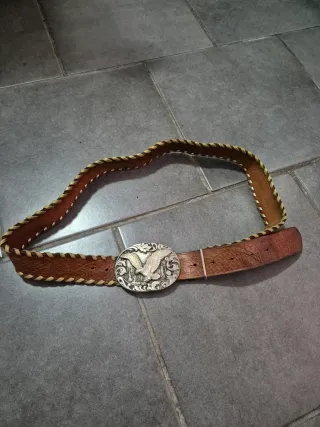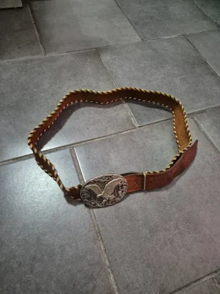 Elegante cintura vintage con un design unico. - Fibbia rotonda in metallo con aquila. - Dettagli lavorati sul cuoio. - Bordi rifiniti con cuciture a contrasto.