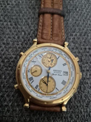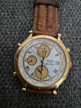 Orologio funzionante da cambiare batteria orologio da polso Seiko con cinturino in pelle marrone e cassa color oro. Il quadrante bianco presenta indicatori romani e dettagli dorati, con funzioni di cronografo e allarme. - Ghiera girevole con nomi di città per la funzione World Timer. - Datario a ore 3. - Corona e pulsanti in oro. - Cinturino in pelle autentica.