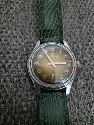Orologio Oidus con carica manuale e cinturino in pelle. Il quadrante presenta una finitura sfumata che varia tra tonalità di verde e oliva. - Cinturino in pelle con texture a squame. - Carica manuale.