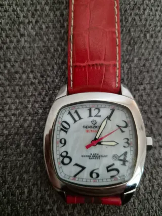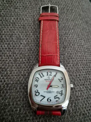Elegante orologio da polso con cassa argentata e cinturino in pelle rossa. - Quadrante bianco con numeri neri. - Resistente all'acqua fino a 5 ATM. - Movimento al quarzo.
