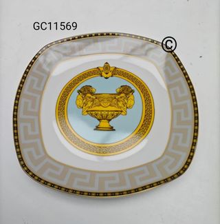 Elegante piattino antico realizzato in legno scuro con venature a vista. Al centro è presente un medaglione dorato con un bassorilievo. - Materiale: Legno - Decorazione: Medaglione in rilievo