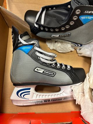 Scarponi da hockey Bauer Supreme 11. - Colore grigio e nero con dettagli blu. - Chiusura con lacci bianchi. - Lama Tuuk Fasteel. 42 misura
