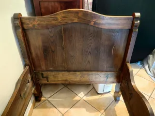 Letto singolo realizzato artigianalmente in legno. La struttura è robusta e presenta un design classico. - Doghe e materasso ortopedico semi-nuovo inclusi. - Testiera e pediera sagomate Possibilità di vendita sbinata