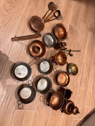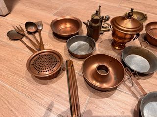 Set di pentolini e utensili da cucina in rame, perfetti per un tocco vintage. - Materiale: Rame - Utensili inclusi: mestoli, schiumarola, forchettone, colino - Pentolini di varie dimensioni