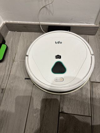 Robot aspirapolvere Trifo MAX-P, ideale per la pulizia della casa. - Design circolare bianco. - Fotocamera integrata. - Pulsanti di controllo sulla parte superiore.