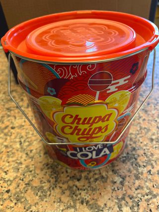 Secchiello in latta a tema Chupa Chups I Love Cola. - Design colorato e vivace. - Ideale come contenitore o oggetto decorativo. - Manico in metallo per un facile trasporto.