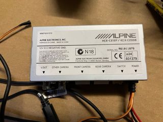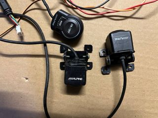 Set di telecamere per parcheggio marca Alpine. - Due telecamere con staffe di montaggio. - Un controller con pulsanti ON/OFF e MODE. - centralina