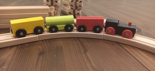 Set di trenino in legno con binari. - Locomotiva nera con dettagli rossi. - Carrozze colorate: gialla, verde e rossa. - Binari in legno per creare il percorso.