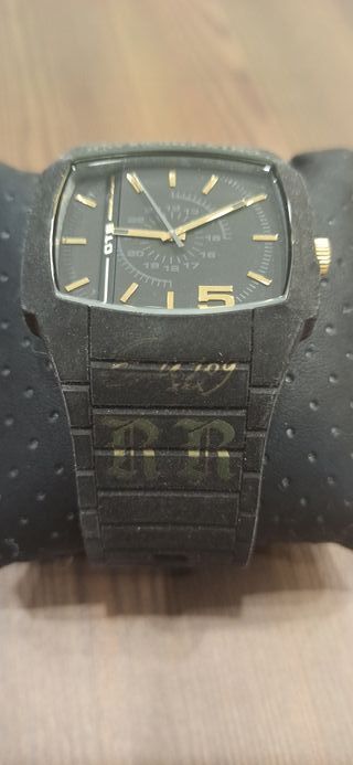 Orologio da polso Diesel in edizione esclusiva per il 55° compleanno. - Quadrante nero con dettagli dorati. - Cinturino in gomma nera. - Design squadrato distintivo.