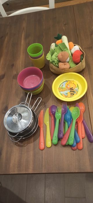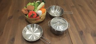 Set di giocattoli per la cucina, perfetto per i più piccoli. Include un cesto pieno di verdure di stoffa e tre pentole in metallo. - Cesto con verdure di stoffa (pomodoro, carota, cipolla, funghi, lattuga, zucchina). - Tre pentole in metallo di diverse dimensioni, una con coperchio. - Completo di piattini,posate e bicchieri in plastica.