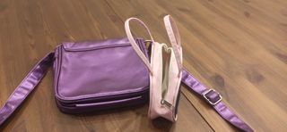 Set composto da due borsette per bambina. - Borsetta viola con stampa Top Model e personaggio. - Borsetta rosa con stampa corona e scritta monaco.