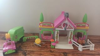 Set da gioco Horse Club per creare la tua fattoria. - Include una fattoria con stalle e recinti. - Comprende veicoli come un fuoristrada rosa e un rimorchio verde. - Sono presenti accessori come fiori e una carriola.