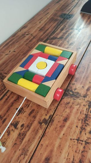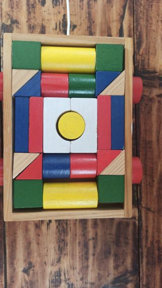 Set di costruzioni in legno con blocchi di diverse forme e colori. Ideale per stimolare la creatività. - Blocchi colorati: rosso, blu, giallo, verde e bianco. - Forme geometriche varie: cubi, cilindri, triangoli e rettangoli. - Base in legno per contenere i blocchi. - Ruote rosse e corda per trasformarlo in un giocattolo da trainare.