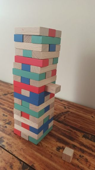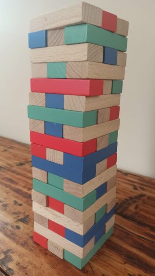 Torre di blocchi in legno per giochi di abilità e destrezza. I blocchi sono colorati con fasce rosse, verdi e blu. - Materiale: legno. - Colori: legno naturale, rosso, verde, blu. - Con dadi per sorteggio