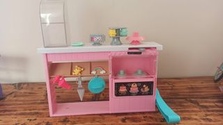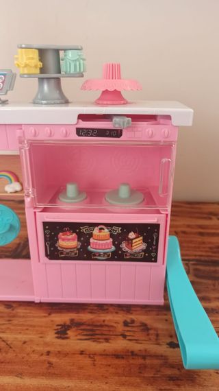 Set da pasticceria per bambole Barbie. Include vari accessori per creare dolci. - Banco da pasticceria rosa. - Accessori come mixer, tortiere e decorazioni. - Elementi decorativi a tema (orsetto, arcobaleno, torte). - Utensili da cucina in miniatura.