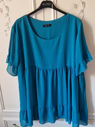 Maglietta da donna con un bel design. Poliestere elastico Lunghezza cm 76 da ascella ad ascella cm 60 larghezza spalle cm 48 - Maniche corte con volant. - Scollo rotondo. - Orlo con volant.